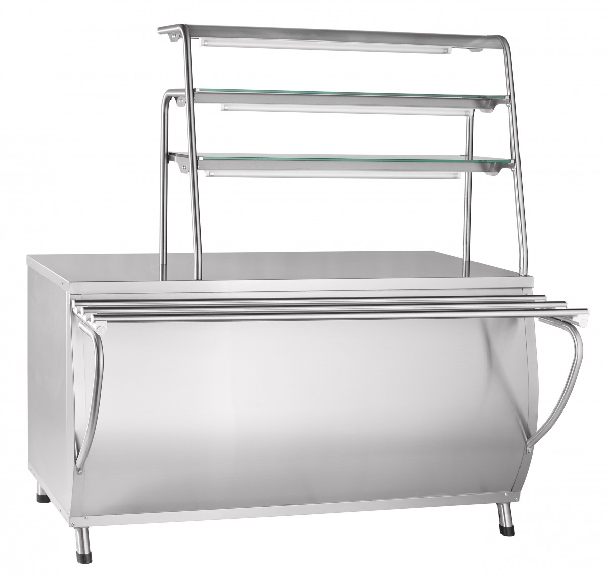 Прилавок для горячих напитков предназначен для кратковременного хранения хлебобулочных и кондитерских изделий, а также для установки на его столе электронагревательный прибор (электрочайник) с напитками. Используется на предприятиях общественного питания самостоятельно или в составе технологических линий.
