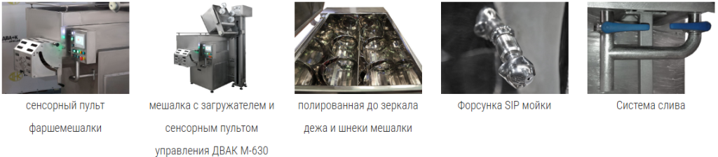Спиральные шнеки, для бережного перемешивания. Не затягивают воздух в перемешиваемую массу (фарш), делая её более плотной.
