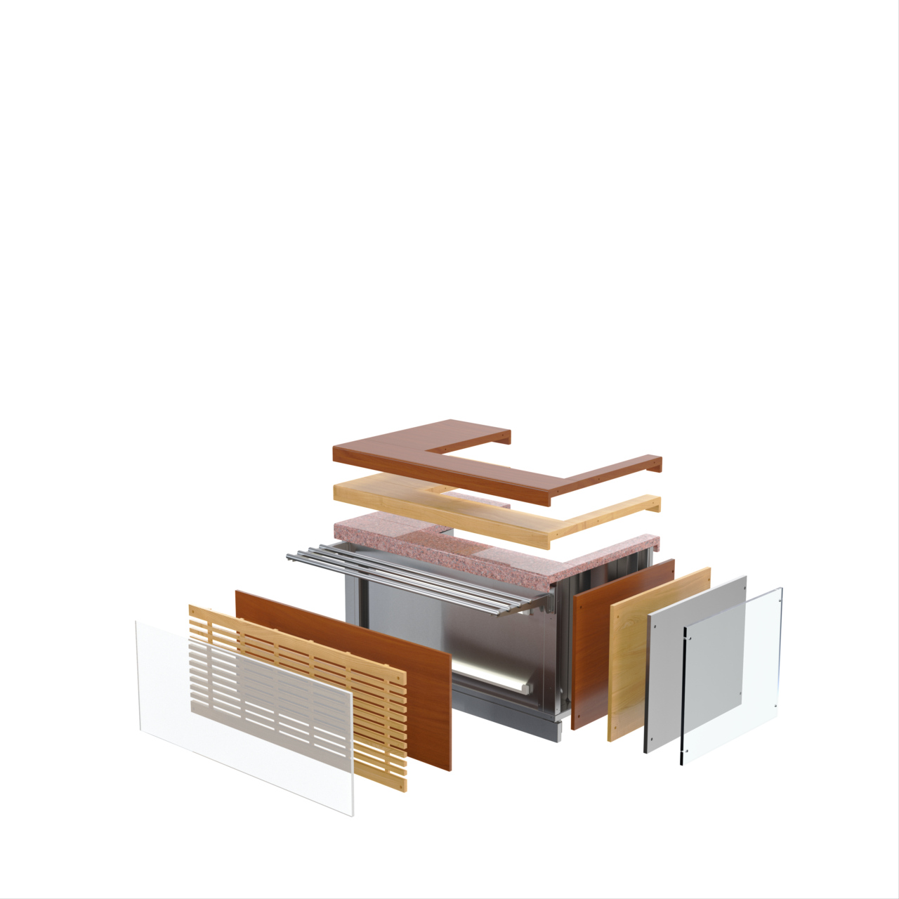 - Большой выбор вариантов облицовки: натуральное дерево, искусственный камень, ламинированная ДСП, скинали, нержавеющая сталь.