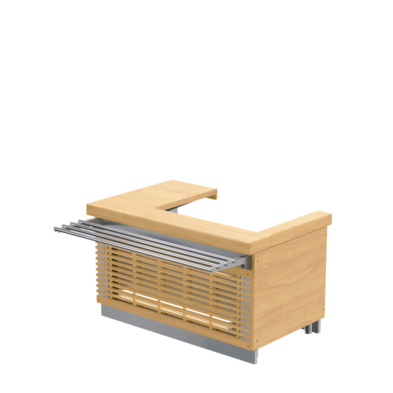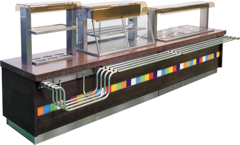 - Может быть оснащён направляющими, которые соединяются друг с другом в единую ровную поверхность с помощью специальных элементов, что обеспечивает беспрепятственное и лёгкое скольжение подносов.