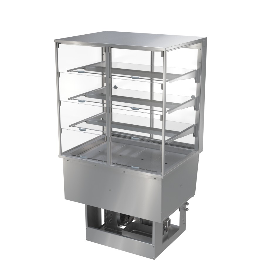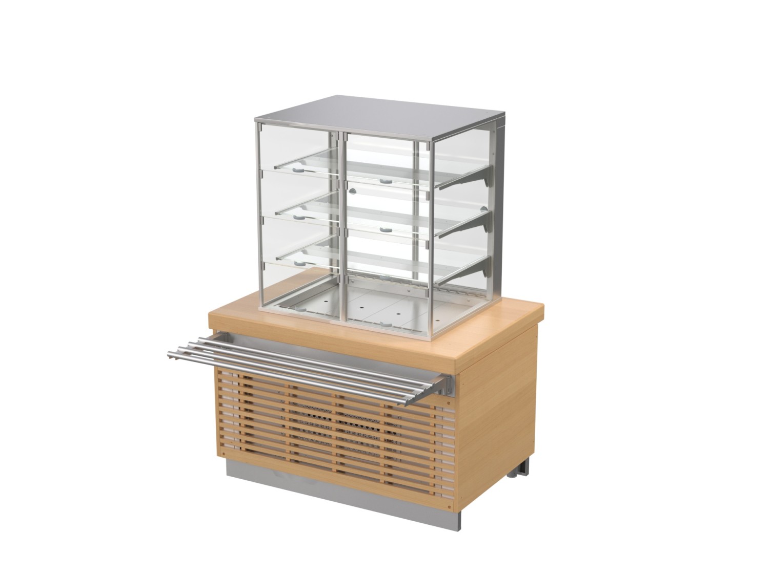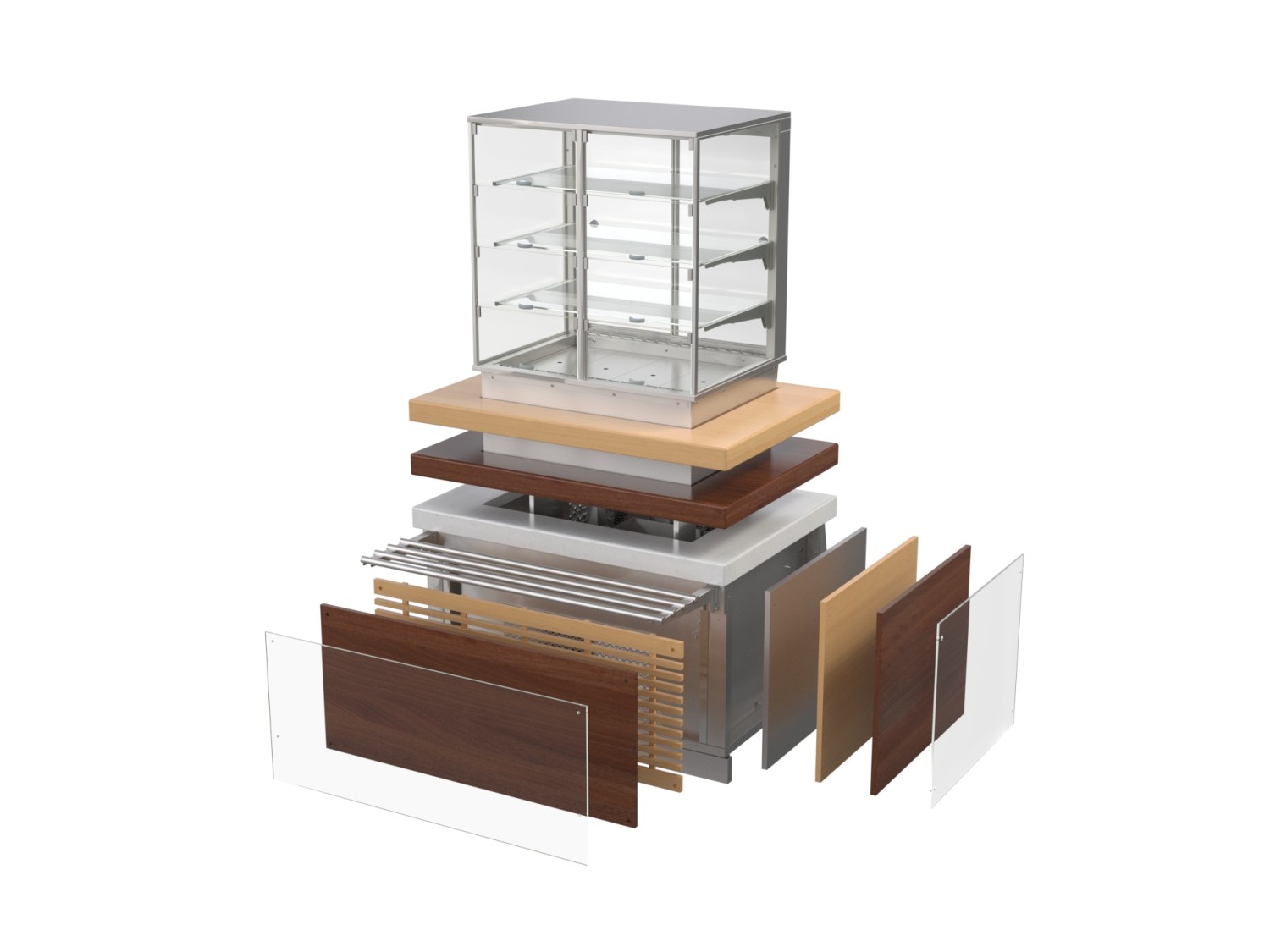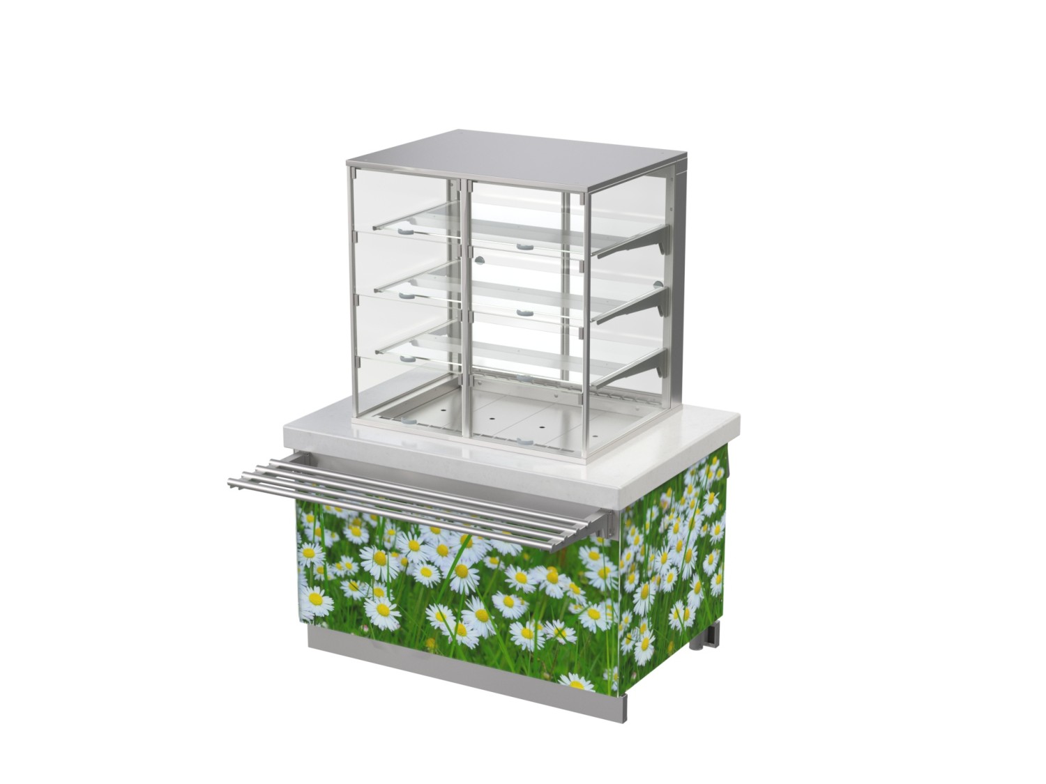 - Корпус витрины из стеклопакетов и светодиодная подсветка каждой полки обеспечивают полный обзор демонстрируемых блюд, привлекая внимание клиентов и, вызывая повышенный спрос.
