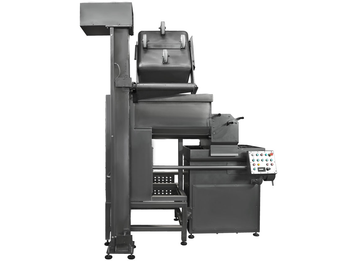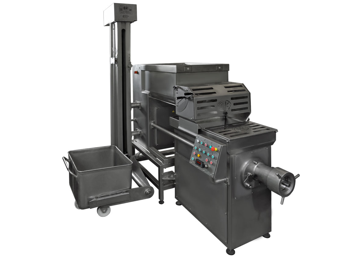 Объединение оборудования в единый комплекс позволяет после смешивания в мешалке выгружать массу в бункер измельчения волчка, минуя транспортировку, что значительно сокращает процесс приготовления необходимого продукта. Минимальное время транспортировки позволяет минимизировать нагрев или охлаждение сырья, сокращает трудозатраты.