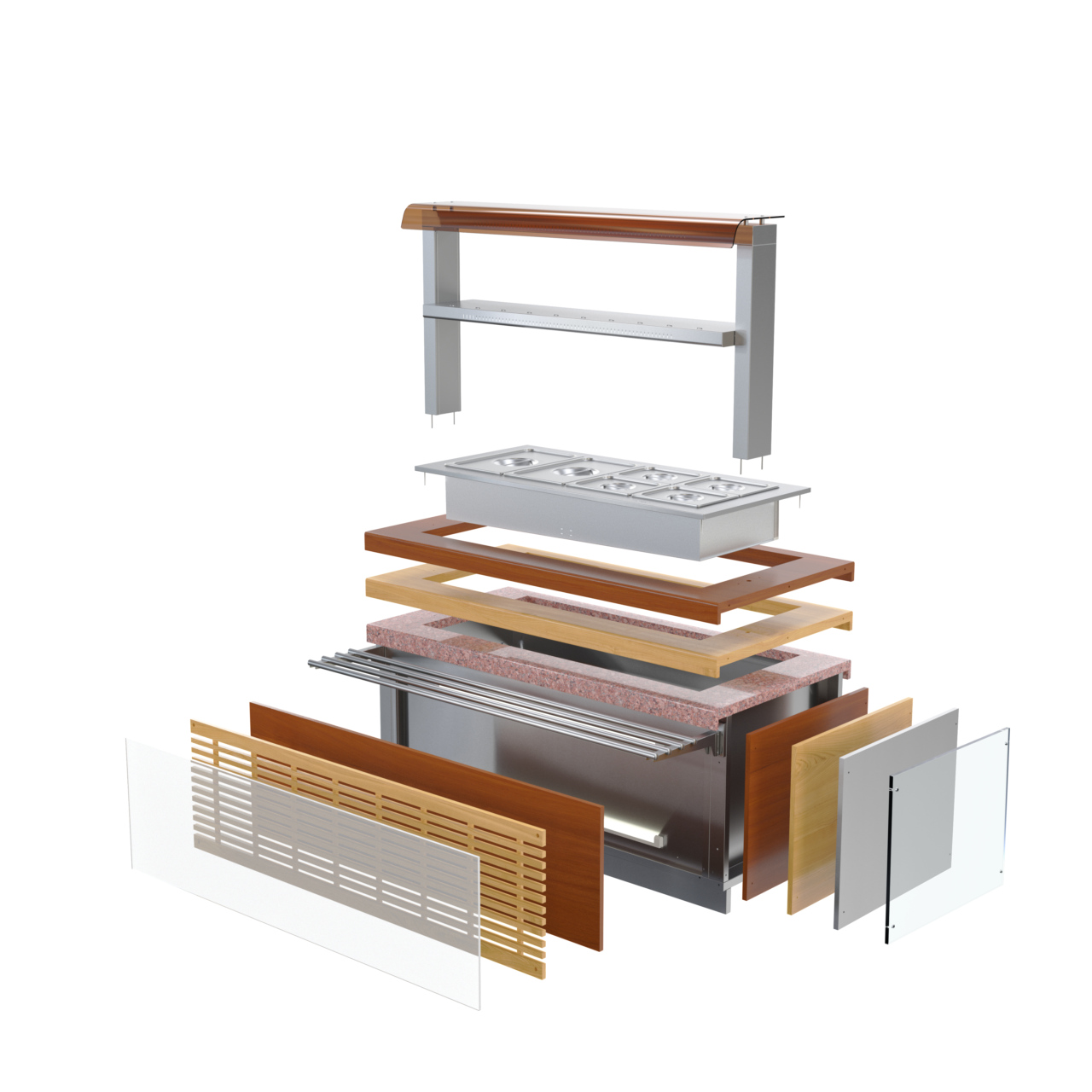 • Защитное лобовое стекло первого яруса 2-х ярусной полки предотвращает попадание посторонних предметов и грязи в пищу.