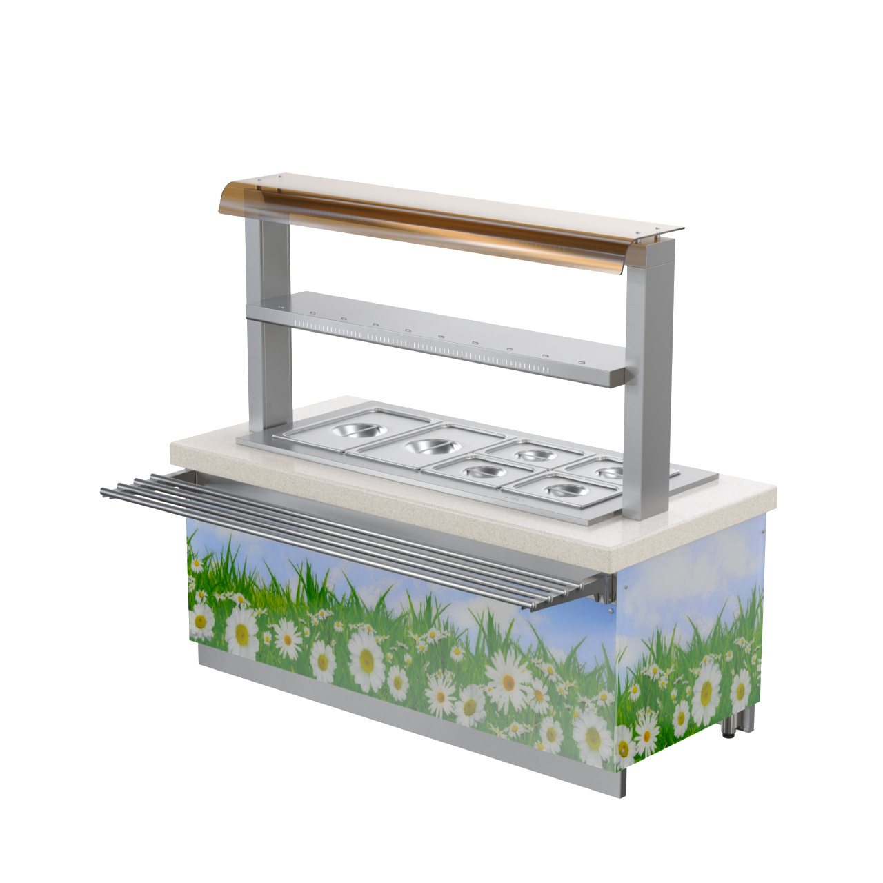 • Защитное лобовое стекло первого яруса 2-х ярусной полки предотвращает попадание посторонних предметов и грязи в пищу.