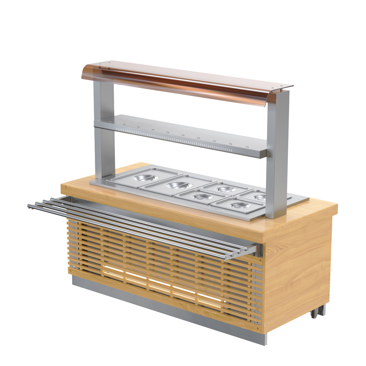 • Имеется возможность комплектования 1-но или 2-х ярусной полкой для размещения тарелок с блюдами.