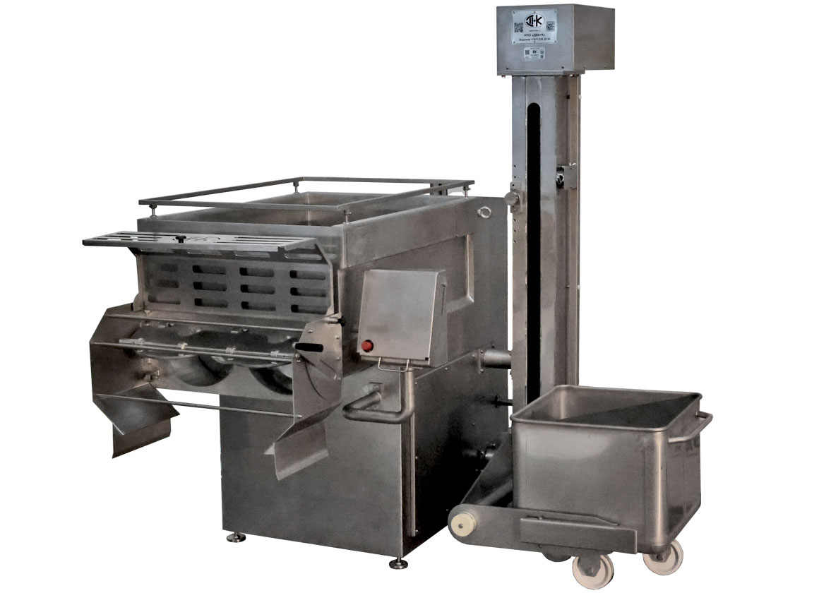Мешалка предназначена для перемешивания различных фаршей, смесей и масс. Рассчитана на единовременную загрузку 400 литров (~400кг по мясному фаршу — 2 стандартные тележки «Чебурашка» по 200 литров).