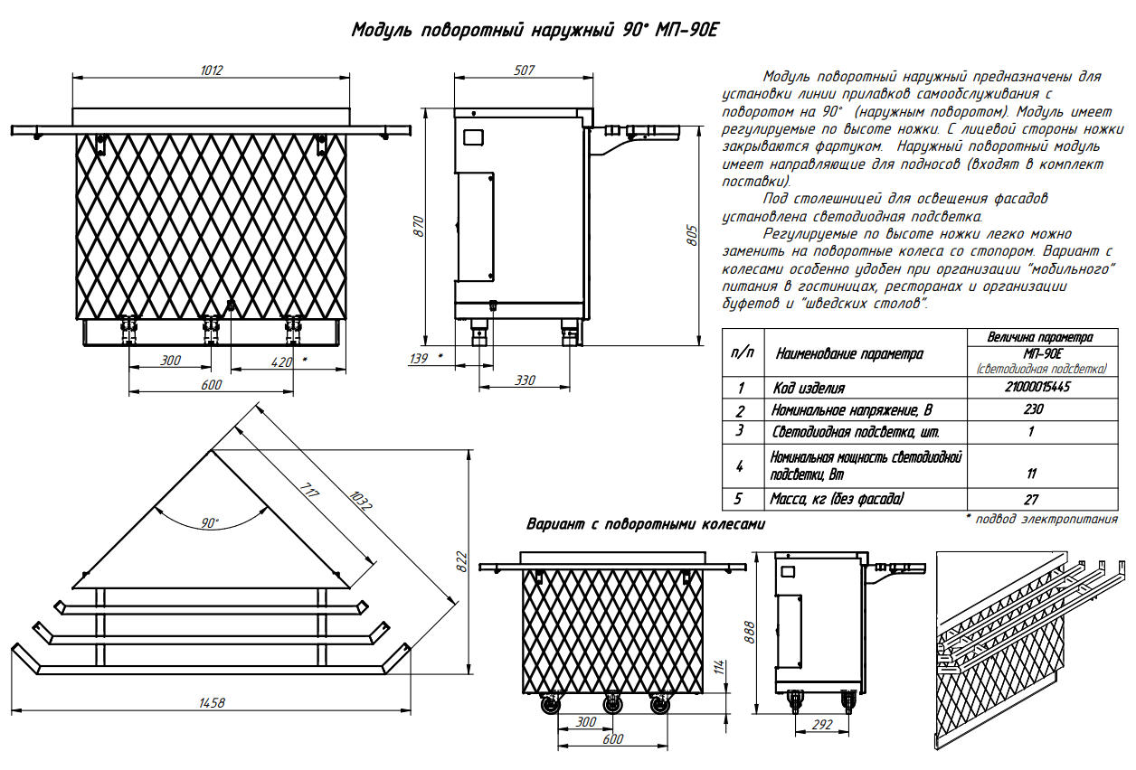 Модуль поворотный МП-90Е, предназначен для установки линии прилавков самообслуживания с поворотом на 90°.