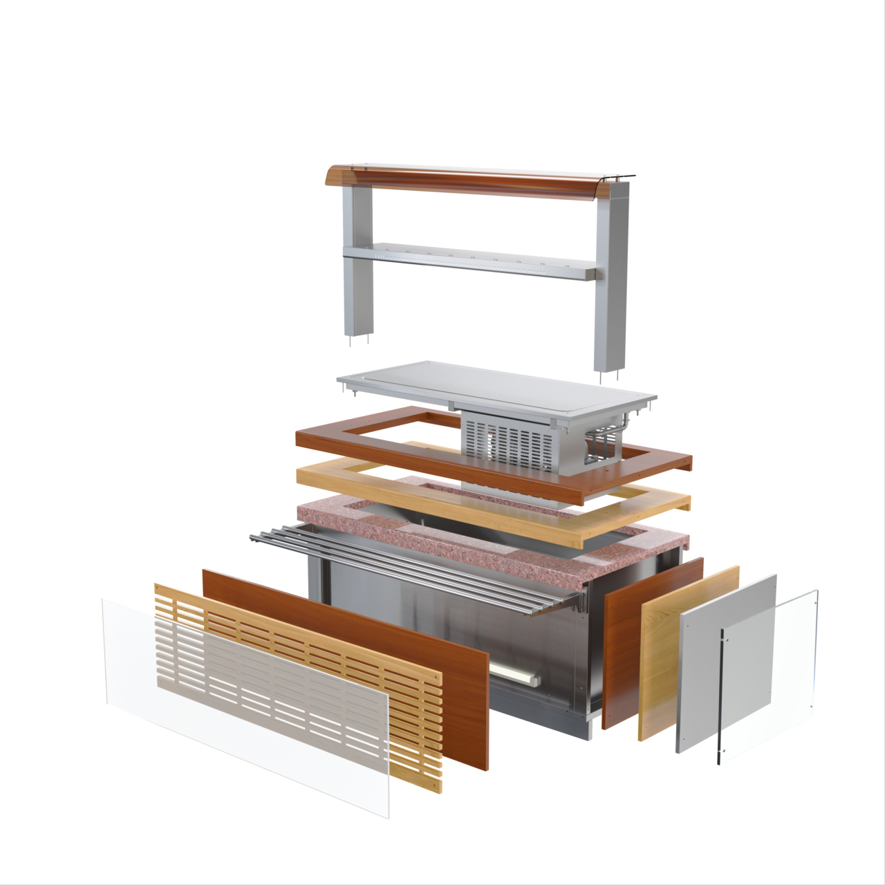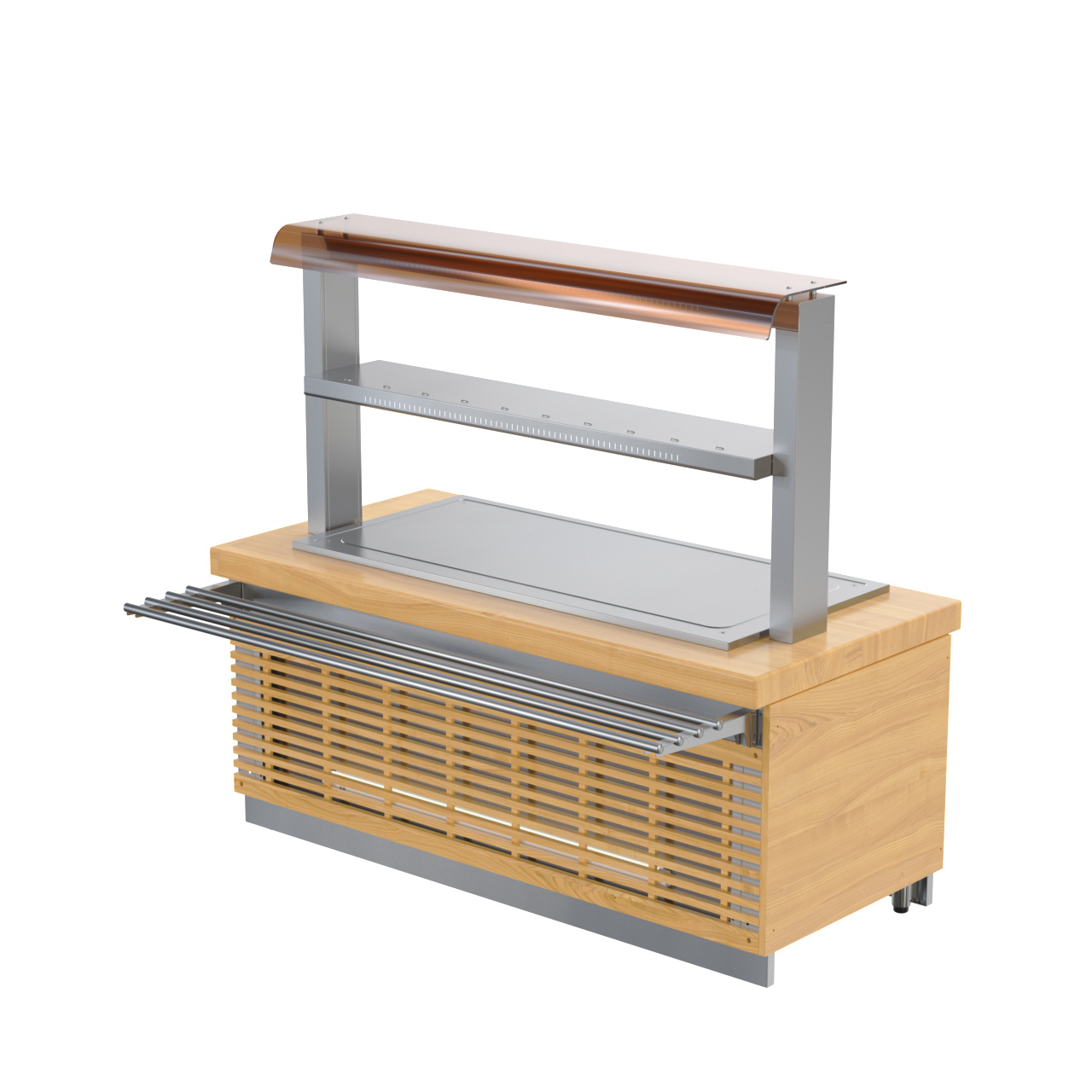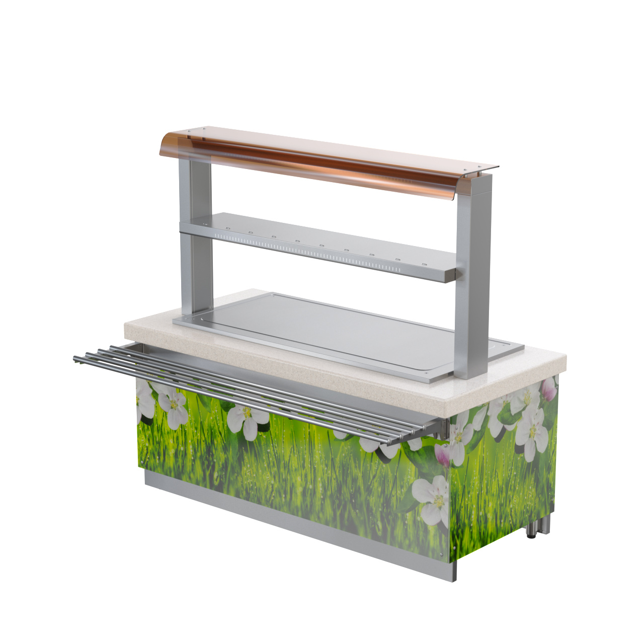 • Защитное лобовое стекло первого яруса 2-х ярусной полки предотвращает попадание посторонних предметов и грязи в пищу.