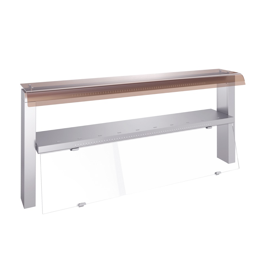 Конструкция сборная, бескаркасная. Полка выполнена из нержавеющей стали AISI430. В верхней части полки располагается гнутое стекло. Двухъярусная полка имеет два светильника. Один освещает столешницу, другой – среднюю полку. Двухъярусная полка имеет защитное стекло, предотвращающее попадание грязи на продукты.