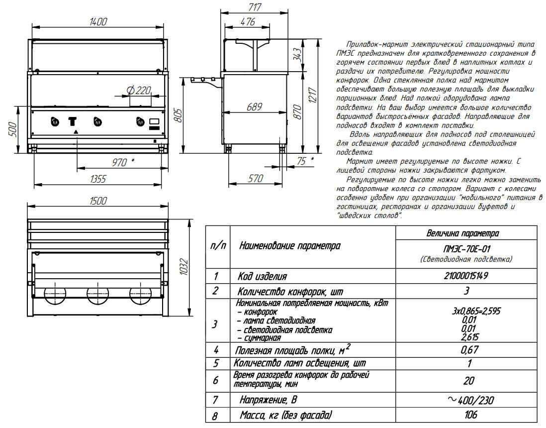 Прилавок мармит электрический для первых блюд предназначен для кратковременного хранения в горячем состоянии первых блюд в наплитных котлах и раздачи их потребителю на предприятиях общественного питания самостоятельно или в составе технологических линий.