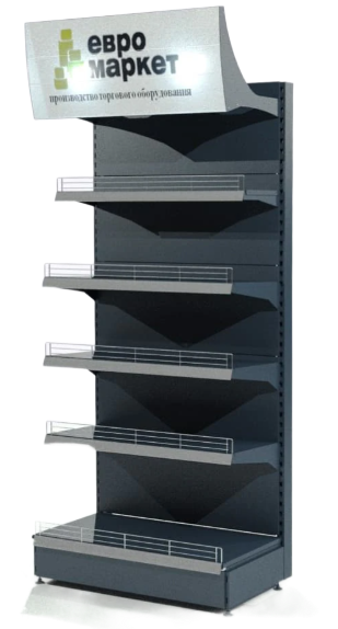 Стеллаж пристенный с рекламным фризом используется для продажи востребованных товаров. Яркое оформление привлекает покупателей, способствует увеличению уровня продаж.