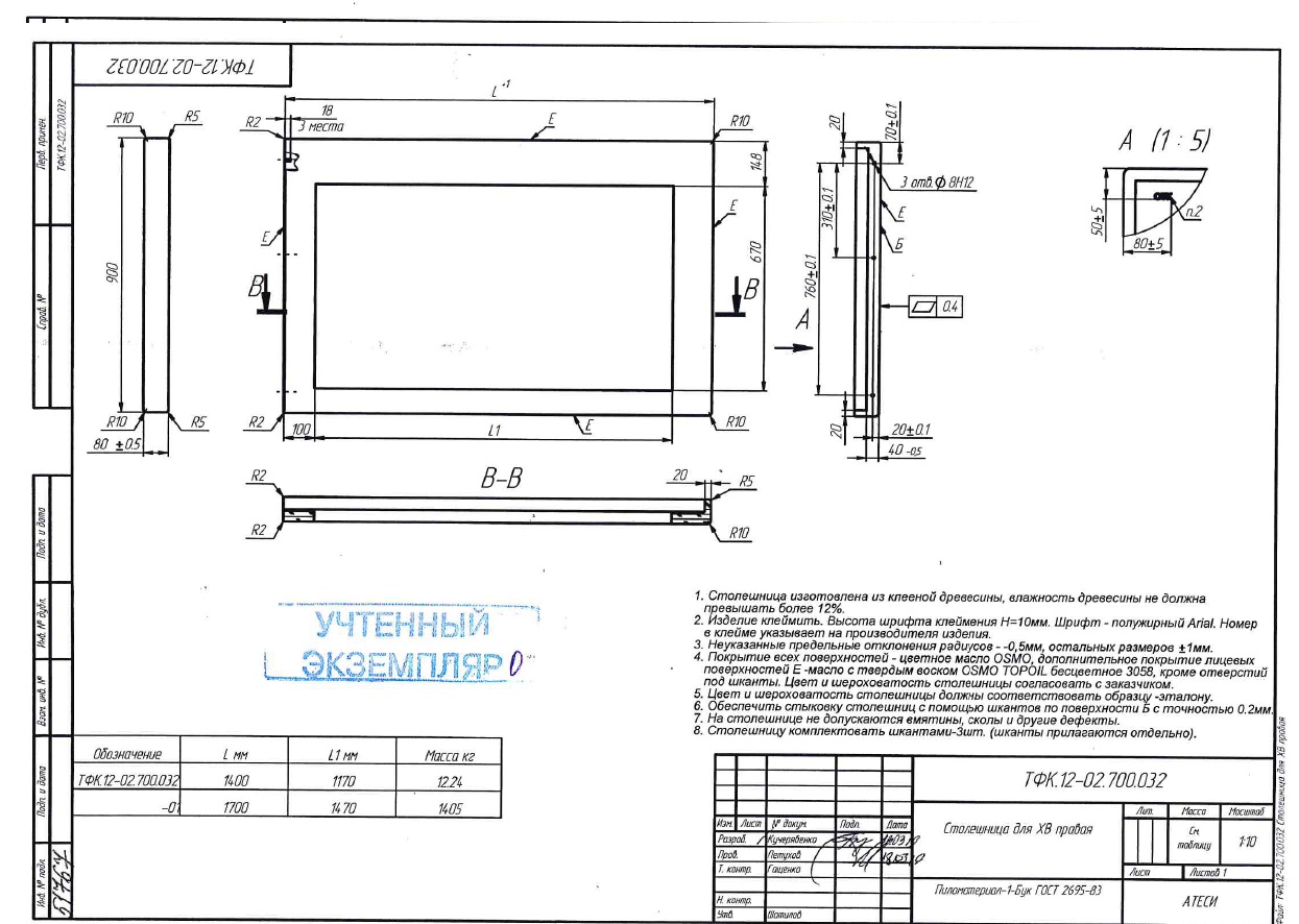 Столешница выполнена из натуральной древесины (бук). Поверхность столешницы покрыта экологически чистым маслом с твёрдым воском, что значительно упрощает санитарно-гигиеническую обработку изделия и при необходимости его реставрацию. Это покрытие влагостойкое и безвредное при контакте с пищевыми продуктами.