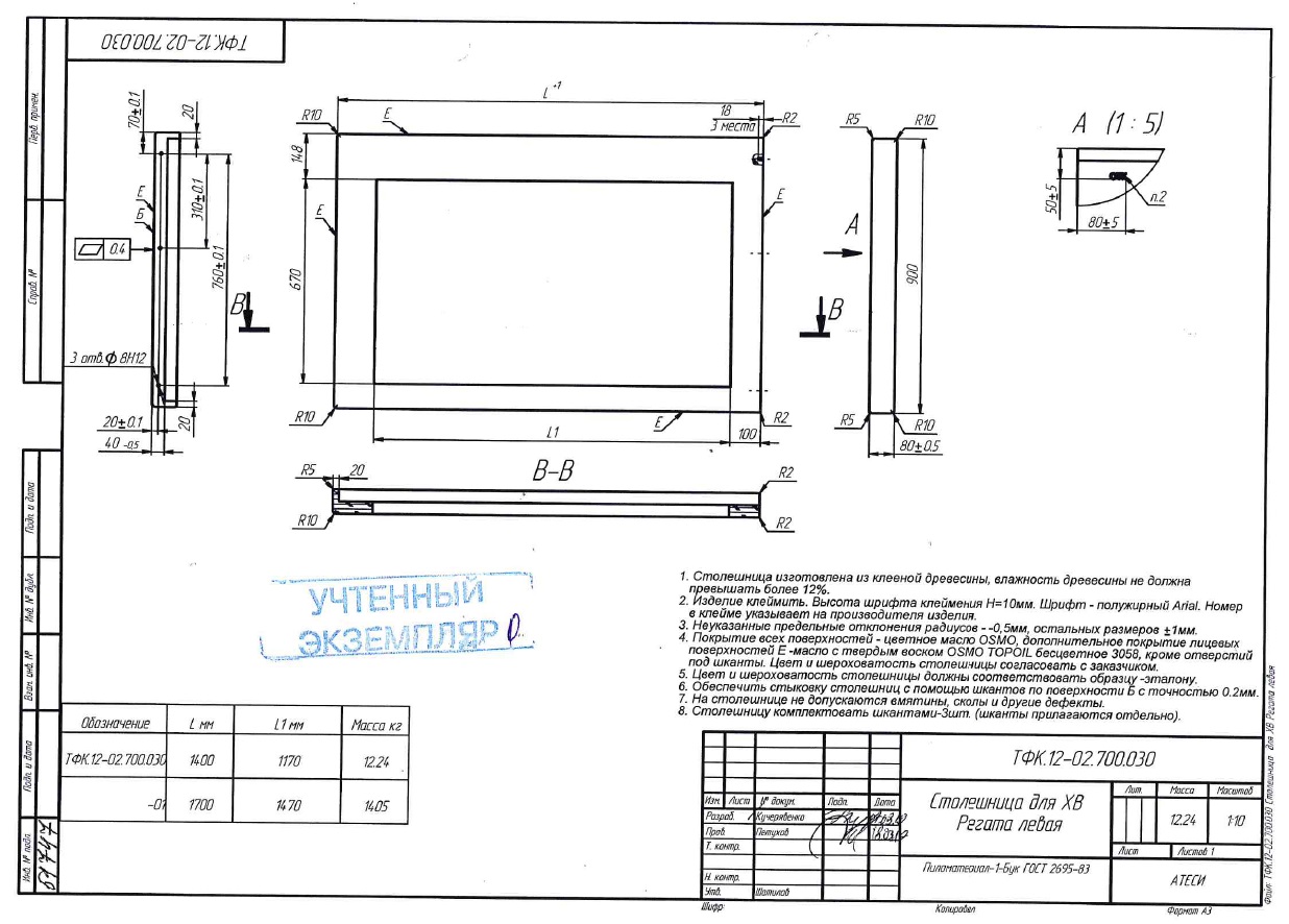 Столешница выполнена из натуральной древесины (бук). Поверхность столешницы покрыта экологически чистым маслом с твёрдым воском, что значительно упрощает санитарно-гигиеническую обработку изделия и при необходимости его реставрацию. Это покрытие влагостойкое и безвредное при контакте с пищевыми продуктами.