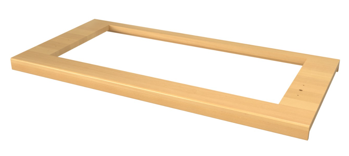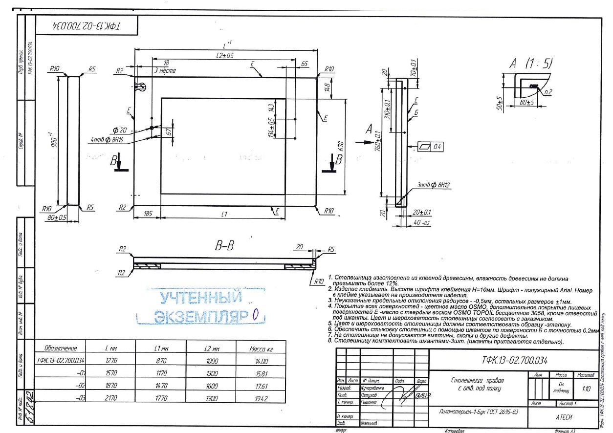 Столешница выполнена из натуральной древесины (бук). Поверхность столешницы покрыта экологически чистым маслом с твёрдым воском, что значительно упрощает санитарно-гигиеническую обработку изделия и при необходимости его реставрацию. Это покрытие влагостойкое и безвредное при контакте с пищевыми продуктами. Имеет отверстия для установки полки.