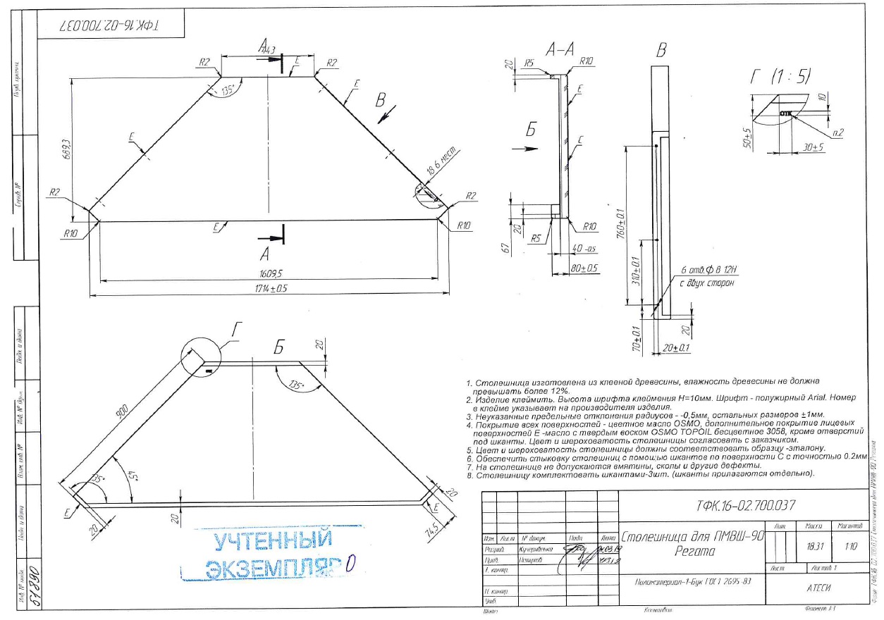 Столешница выполнена из натуральной древесины (бук). Поверхность столешницы покрыта экологически чистым маслом с твёрдым воском, что значительно упрощает санитарно-гигиеническую обработку изделия и при необходимости его реставрацию. Это покрытие влагостойкое и безвредное при контакте с пищевыми продуктами.