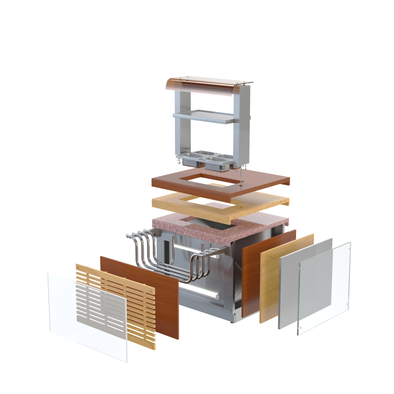 - Большой выбор вариантов облицовки: натуральное дерево, искусственный камень, ламинированная ДСП, скинали, нержавеющая сталь.