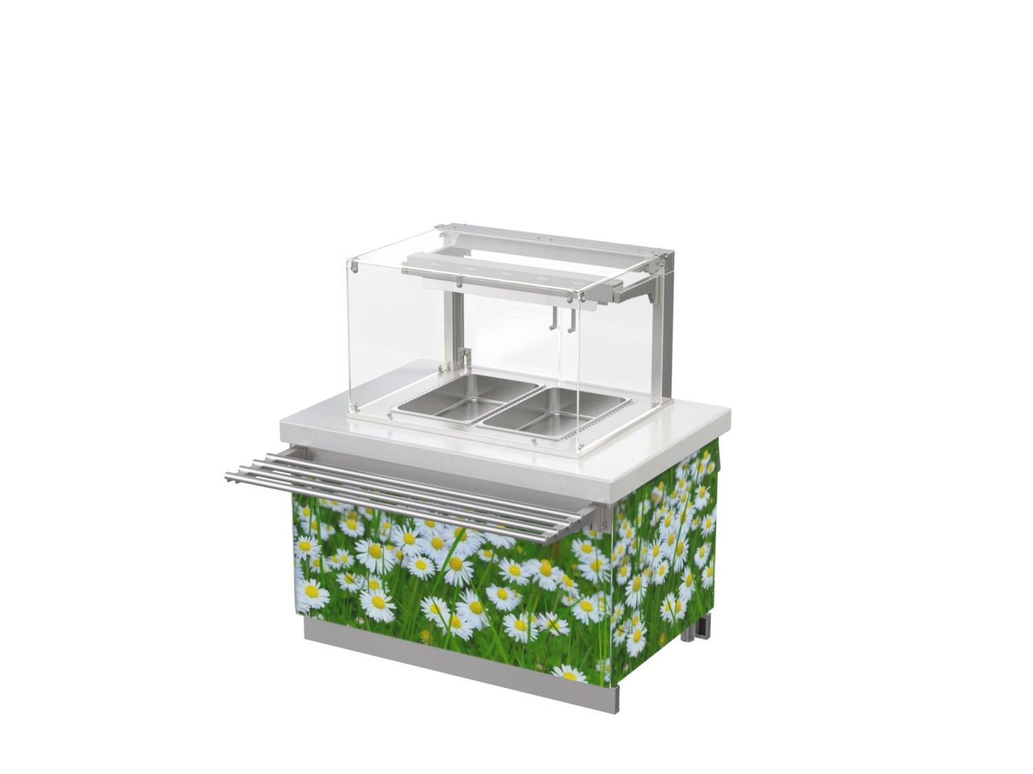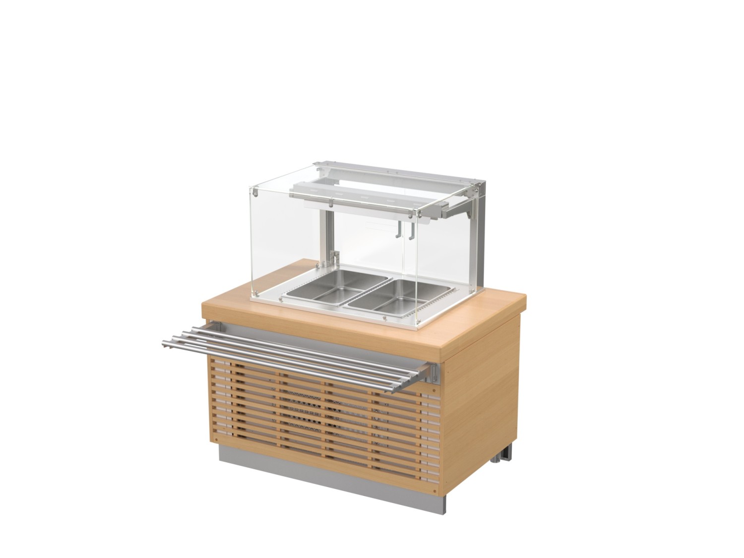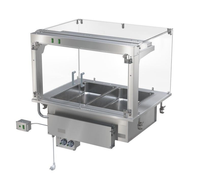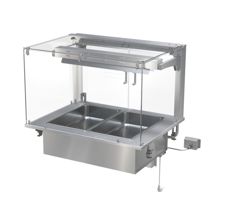 - Сочетание паровой бани под гастроемкостями и верхнего «сухого» нагрева ИК-лампой создает идеальные условия мягкого нагрева, исключая подгорание продуктов, находящихся в гастроемкостях, и, одновременно, устраняет запотевание стекол витрины.