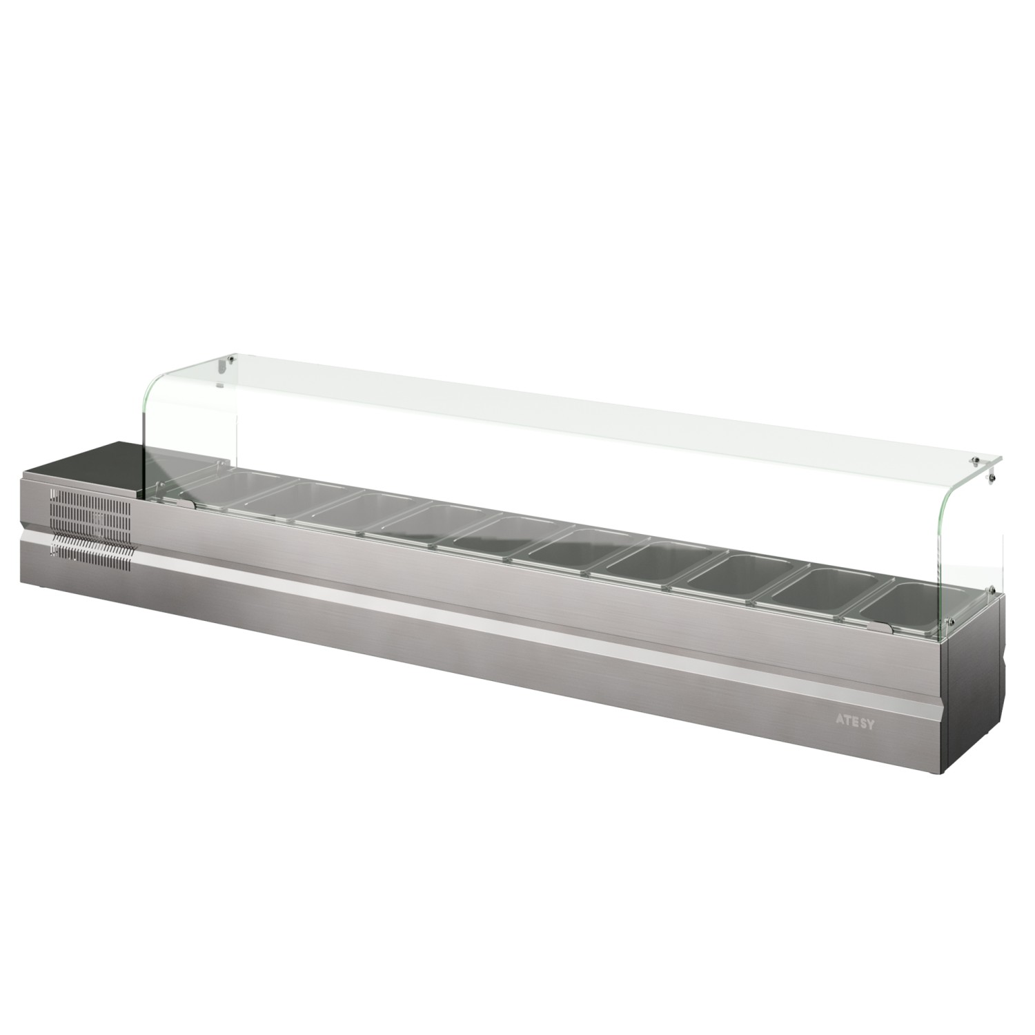 Корпус витрины для компонентов пиццы Болонезе-10 изготовлен из пищевой нержавеющей стали AISI430 и представляет собой охлаждаемую ванну. В ванну устанавливаются гастроемкости GN-1/4 глубиной 150 мм – 10 шт. Для возможности использования гастроемкостей меньшего размера (GN-1/6 и GN-1/9) в комплект поставки входят перемычки из нержавеющей стали. Над охлаждаемой ванной размещается гнутое (моллированное) стекло, которое предотвращает попадание в гастроемкости посторонних предметов. В корпусе витрины встроен отсек холодильного агрегата. Крышка отсека холодильного агрегата выполняет функцию небольшого столика для вспомогательных нужд. Температурный режим витрины +2°С…+8°С обеспечивает длительную сохранность компонентов пиццы в охлажденном состоянии.