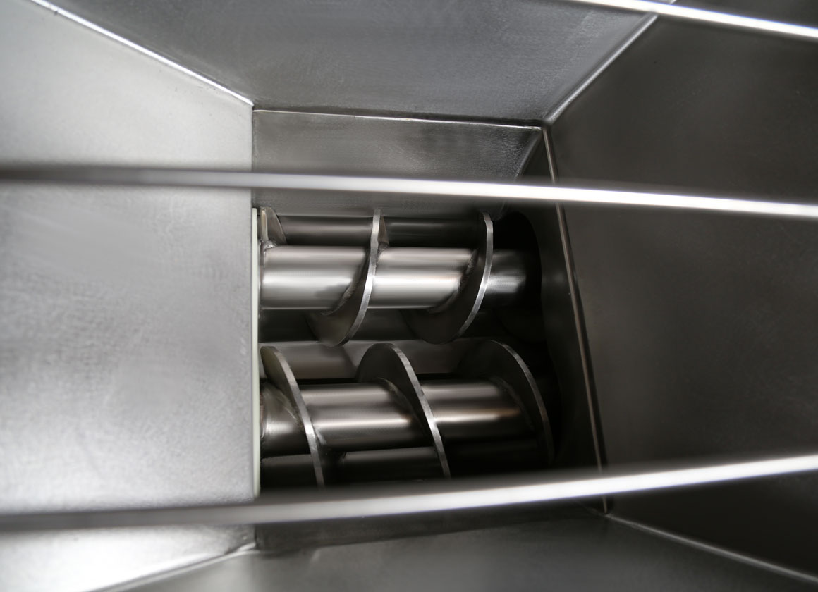 — Двухшнековая схема: первый шнек — питающий, второй шнек — рабочий, эффективно подает сырье в зону резания.