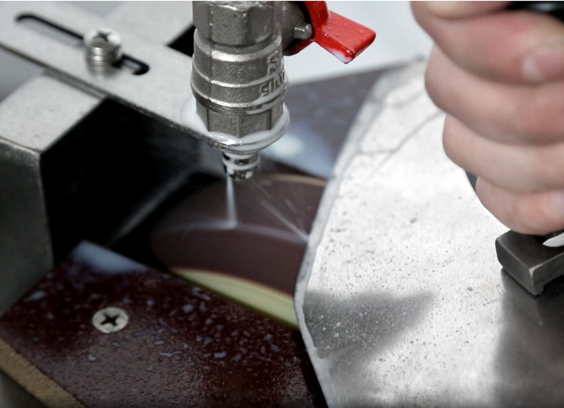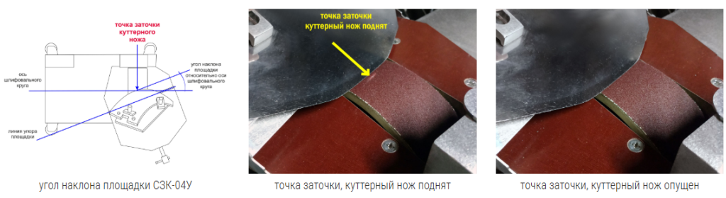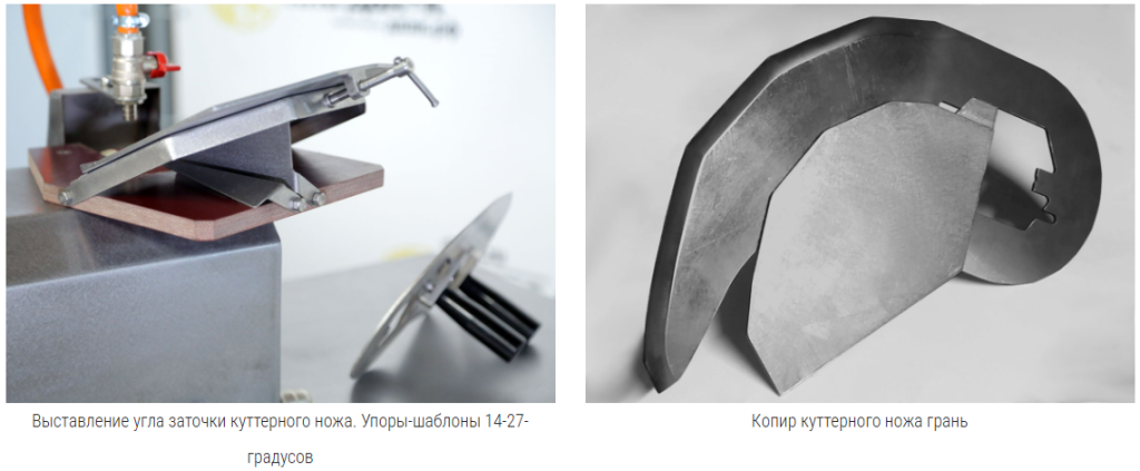 Для обеспечения точечного контакта ножа со шлифовальным кругом, копир (точно повторяющий линию лезвия ножа) упирается в площадку, расположенную под углом к оси шлифовального круга, таким образом обеспечивается плоскостная заточка куттерных ножей разных толщин (2-7 мм).