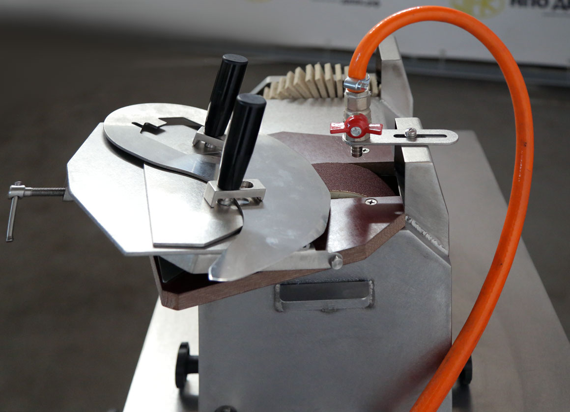 Заточной станок для куттерных ножей обеспечивает правильную заточку режущей кромки куттерного ножа, влияет на качество и степень измельчения фарша, температуру нагрева фарша, продолжительность куттерования, длительность эксплуатации, как ножевой головки, так и самого куттера.