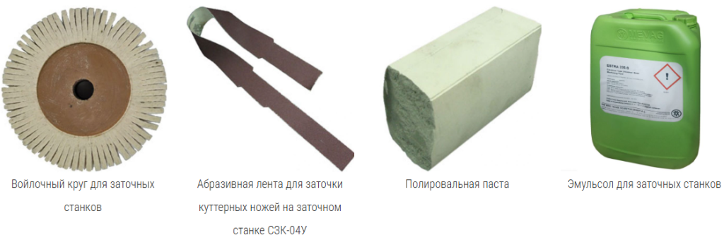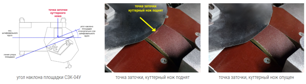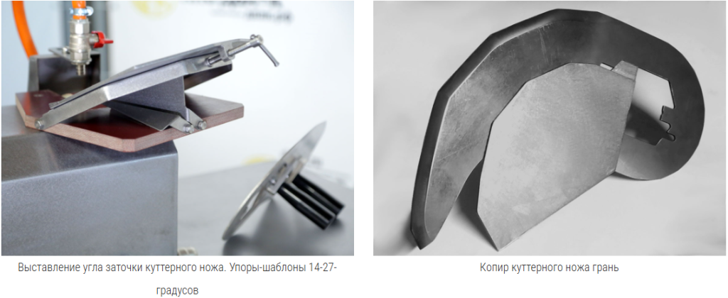 На станке производится заточка и полировка режущей кромки куттерных ножей любых типов (серп, парус, грань(хордовый)), для куттеров от 20 до 750л., как отечественного, так и импортного производства. Преимуществами данного станка является соблюдение им 2-х геометрических размеров: угла заточки и профиля режущей кромки ножа. Доступные расходные материалы, российского производства, простота использования. Для обеспечения точечного контакта ножа со шлифовальным кругом, копир (точно повторяющий линию лезвия ножа) упирается в площадку, расположенную под углом к оси шлифовального круга, таким образом обеспечивается плоскостная заточка куттерных ножей разных толщин (2-7 мм).