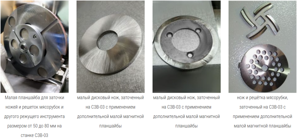 Дополнительно станок может быть укомплектован отдельной планшайбой для заточки ножей и решеток мясорубок малого размера 50-80 мм.